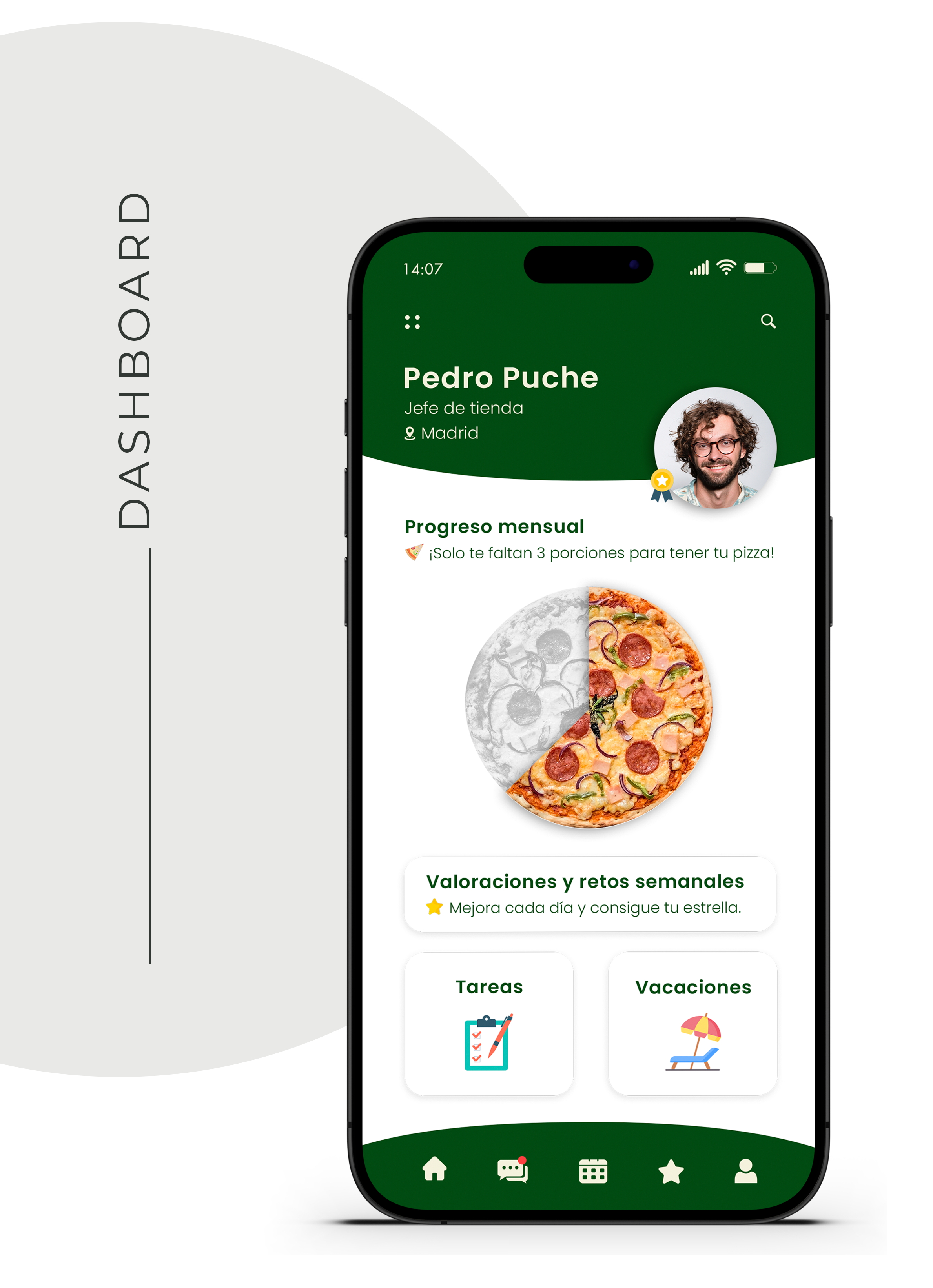 The app is aimed at employees of the restaurant chain, who must see at a glance the most relevant actions/data that make them motivated in their job and with the rest of the team.